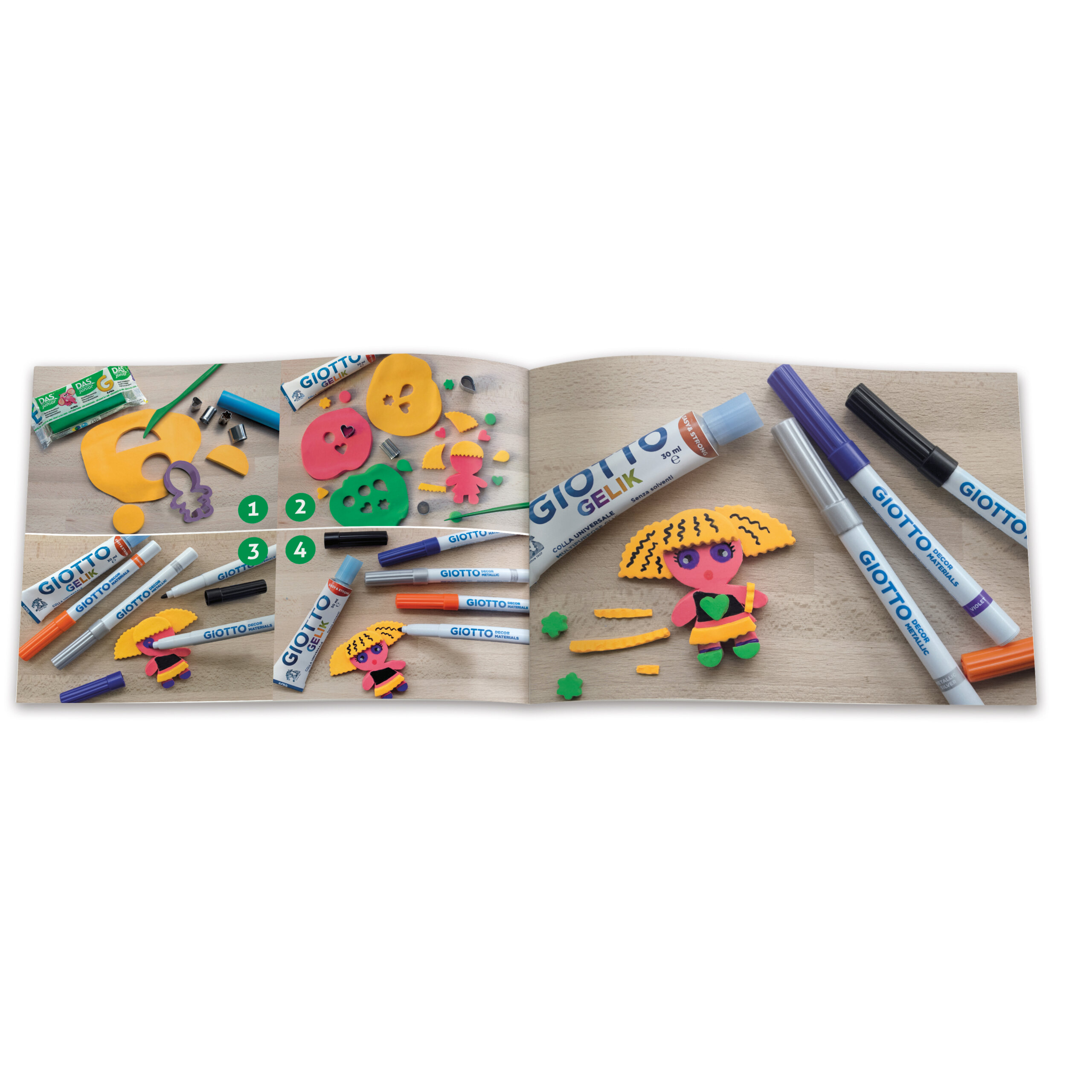 4 גוונים של טושי ג'יאוטו דקור, 3 גוונים של חימר דאס מתייבש באוויר, דבק רב שימושי, מכחול, 4 צורות של שבלונות מתכת, שבלונה בובה, מערוך, כלי כיור מפלסטיק, חוברת רעיונות ליצירה.