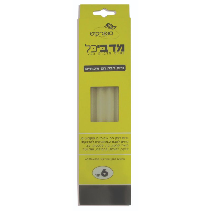 6 נרות לאקדח דבק חם אורך 25 ס"מ עובי 11.2 מ"מ נרות לאקדח דבק חם איכותיים, מקצועיים ונוחים לעבודה להדבקת מוצרי קרטון, בד, פלסטיק, עץ, קלקר, זכוכית, קרמיקה, סול ועוד. מותאמים לשימוש באקדח דבק מקצועי.
